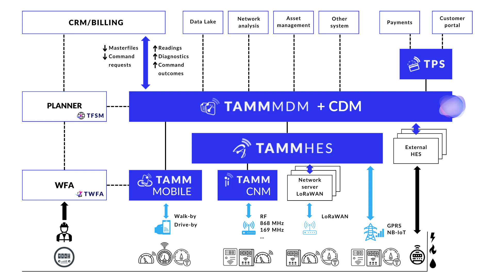 Use TAMM to fully exploit the advantages of remote and bi-directional systems and command management. Minimise field activities and deliver reduced operating costs with minimum environmental impact. Use collected data to unlock new services, improve customer engagement and satisfaction to encourage customer-lead consumption moderation. Furthermore, leverage existing assets, to rationalise your IT infrastructure and streamline field and back office operations.