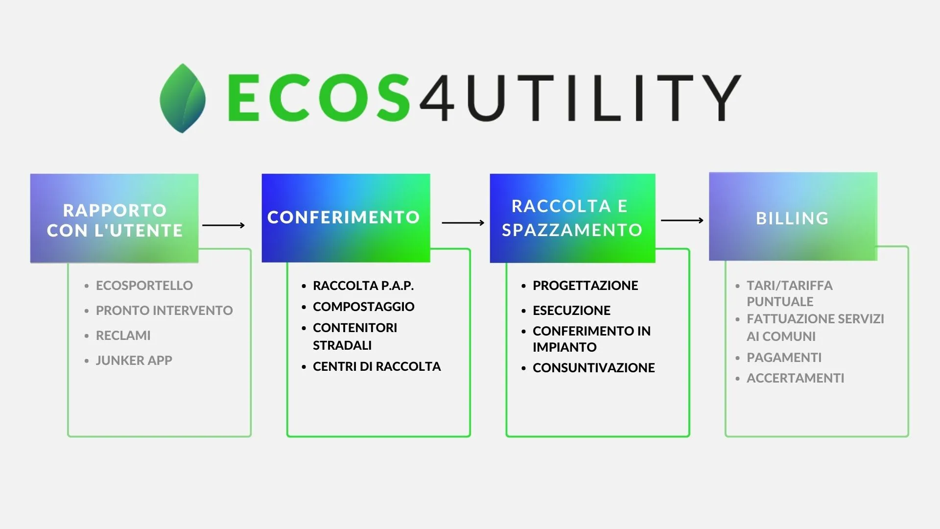 ECOS4UTILITY è la soluzione software integrata e modulare dedicata a soddisfare le esigenze delle Utilities e di tutti gli operatori della gestione dei rifiuti urbani. Nato per dare una risposta alle esigenze di realtà anche molto complesse, si distingue per la totale copertura funzionale e per la completa integrazione tra le varie aree.