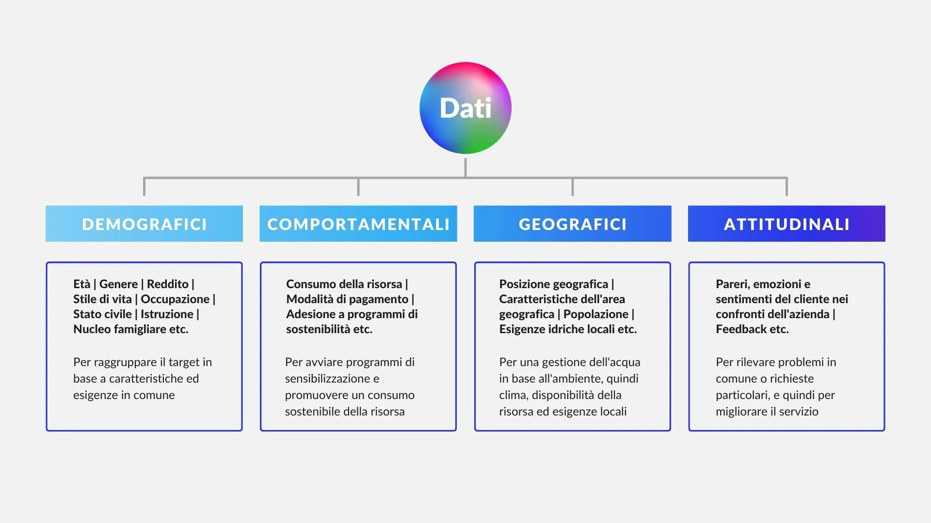 L’analisi dei dati permette di conoscere i bisogni del cliente e quindi di gestirlo in maniera puntuale e personalizzata. Esso sarà, dunque, motivato a collaborare, per esempio, a sostegno dell’integrità della risorsa idrica. I dati sono una sorta di “traccia” rilasciata, in maniera consapevole o non consapevole, dal cliente nel momento in cui entra in contatto con il gestore, e quindi al momento di ogni touchpoint del customer journey. L’approccio data-driven che permette all’impresa di basare il processo decisionale su evidenze dimostrate, potrà essere adattato solo nel momento in cui si ha un cambio di paradigma che porti la cultura del dato a tutti i livelli aziendali, dalle risorse umane a chi gestisce la rete. Questo perché qualsiasi reparto che entri in contatto con il cliente, avrà l’opportunità di raccogliere le sue informazioni e di integrarle in un unico database condiviso da tutta l’azienda. Qui, l’approccio multicanale risulta fondamentale poiché consente di integrare diverse tipologie di dati, provenienti dai diversi canali, per creare una panoramica più completa e accurata dei clienti.