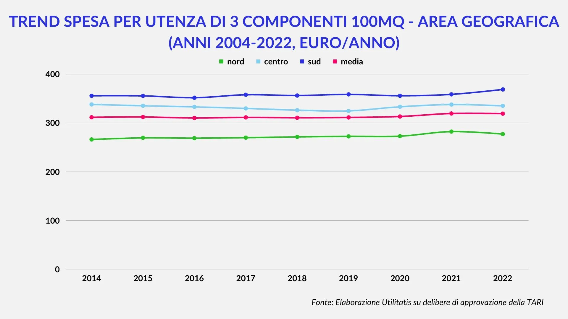 Rispetto alla sostenibilità finanziaria del servizio, sia lato famiglie sia lato utenze non domestiche, la spesa per la Tari assume valori differenziati in funzione delle aree geografiche di riferimento, mantenendo una certa stabilità nel tempo.