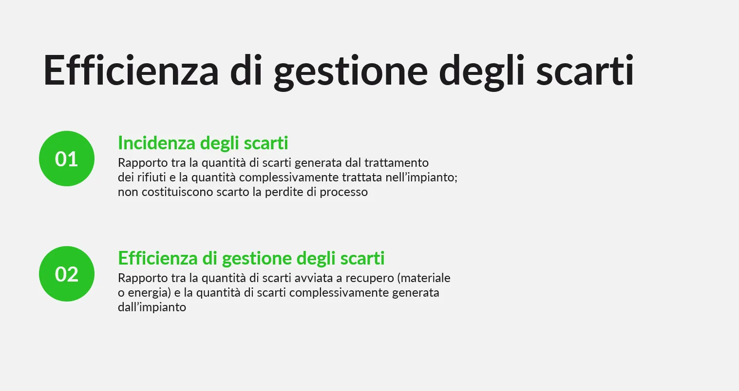 Al fine di valutare l'impatto della disponibilità degli impianti a livello locale sul rispetto della gerarchia dei rifiuti, il terzo titolo richiede l'implementazione di due indicatori che mirano a tracciare l’incidenza degli scarti generati dai processi di trattamento e le modalità di gestione adottate.