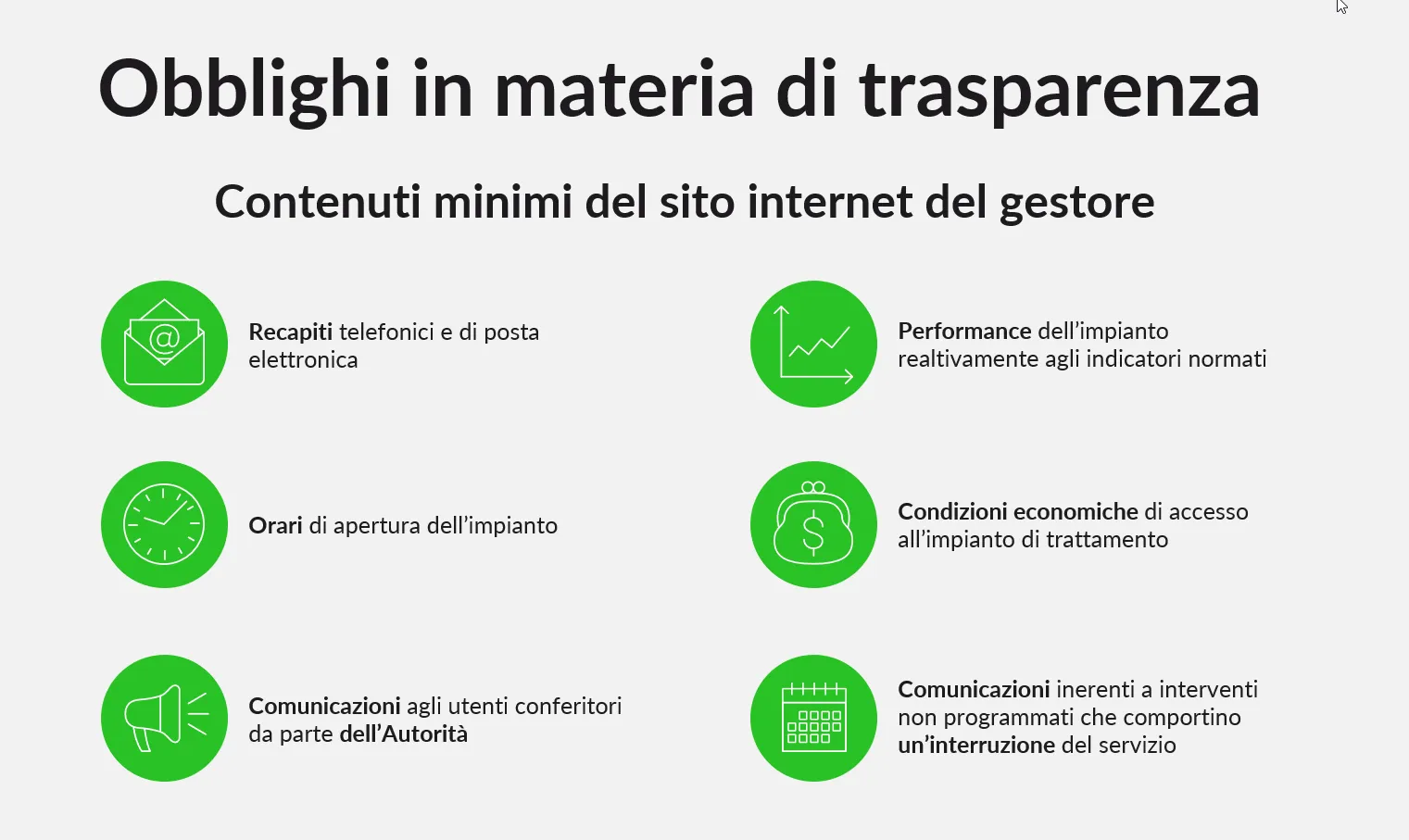 Nel sesto titolo si mira a migliorare la comunicazione tra i gestori degli impianti di trattamento e gli utenti conferitori, garantendo un accesso facilitato alle informazioni pertinenti. Nello specifico, sono contenute le disposizioni in materia di trasparenza per il gestore, che prevedono una serie di contenuti minimi obbligatori da esporre nel sito internet.