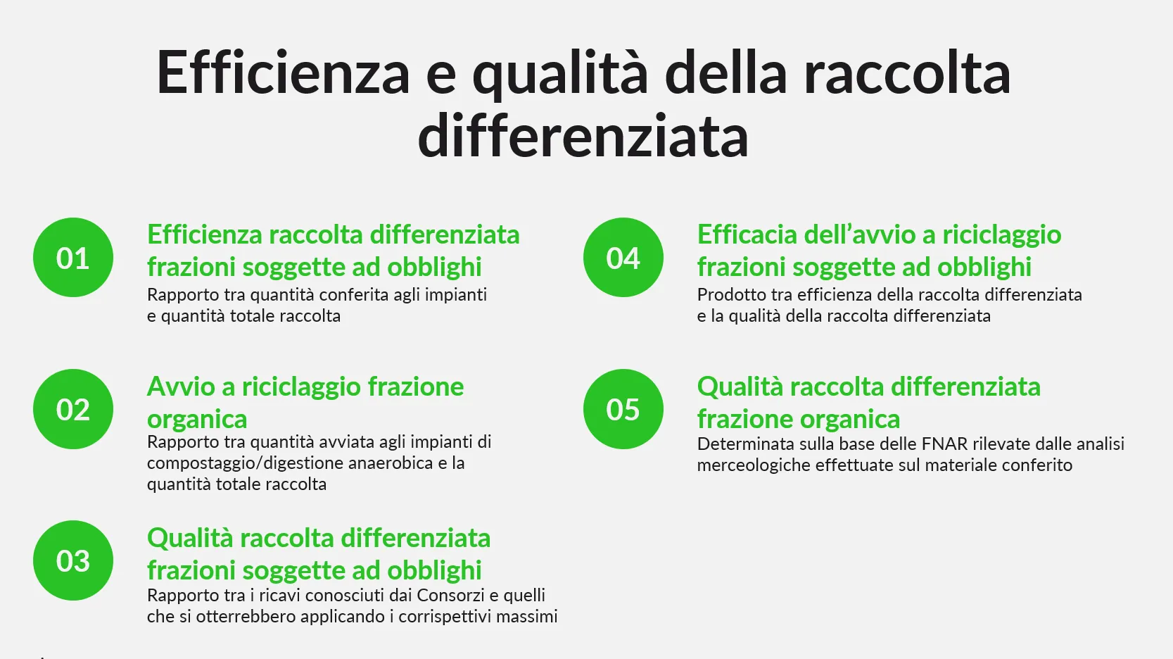 Gli obblighi di monitoraggio e di trasparenza sull’efficienza della raccolta differenziata e sugli impianti di trattamento dei rifiuti urbani si applicano dal 1° gennaio 2024 e si fondano su indicatori ripartiti nelle seguenti categorie: