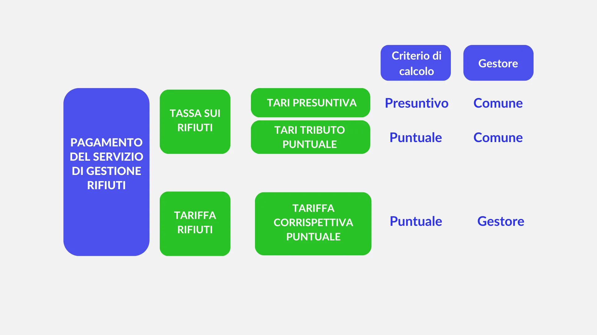 Attualmente quindi esistono sia il vecchio tributo, la TARI, dove ciascuna utenza paga in base a criteri presuntivi di produzione dei rifiuti, e la tariffa puntuale nella quale la quota variabile è commisurata in parte anche al rifiuto conferito, sulla base di misurazioni (dirette o indirette) del rifiuto urbano residuo.