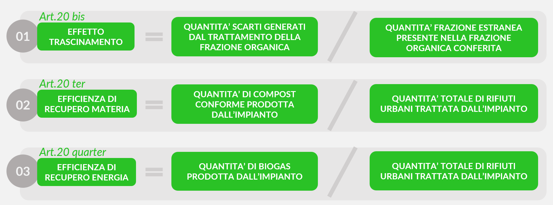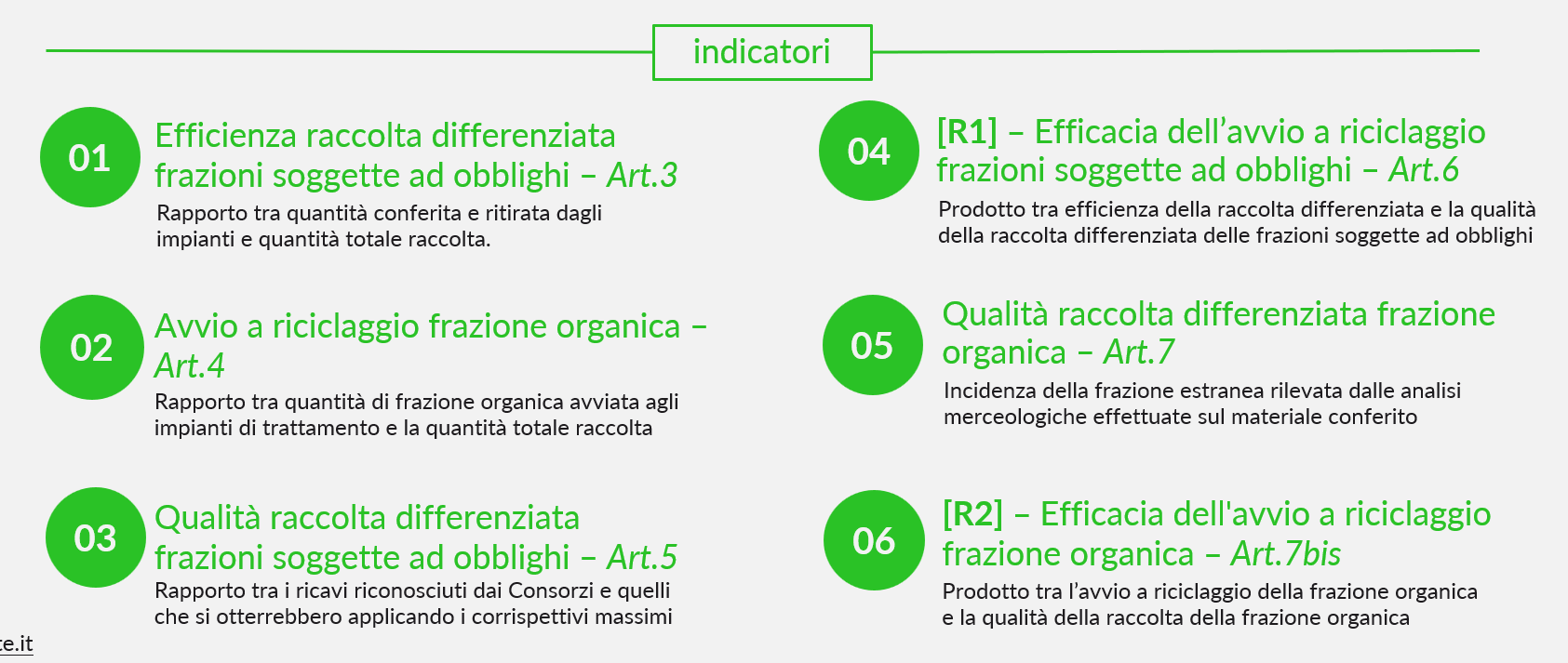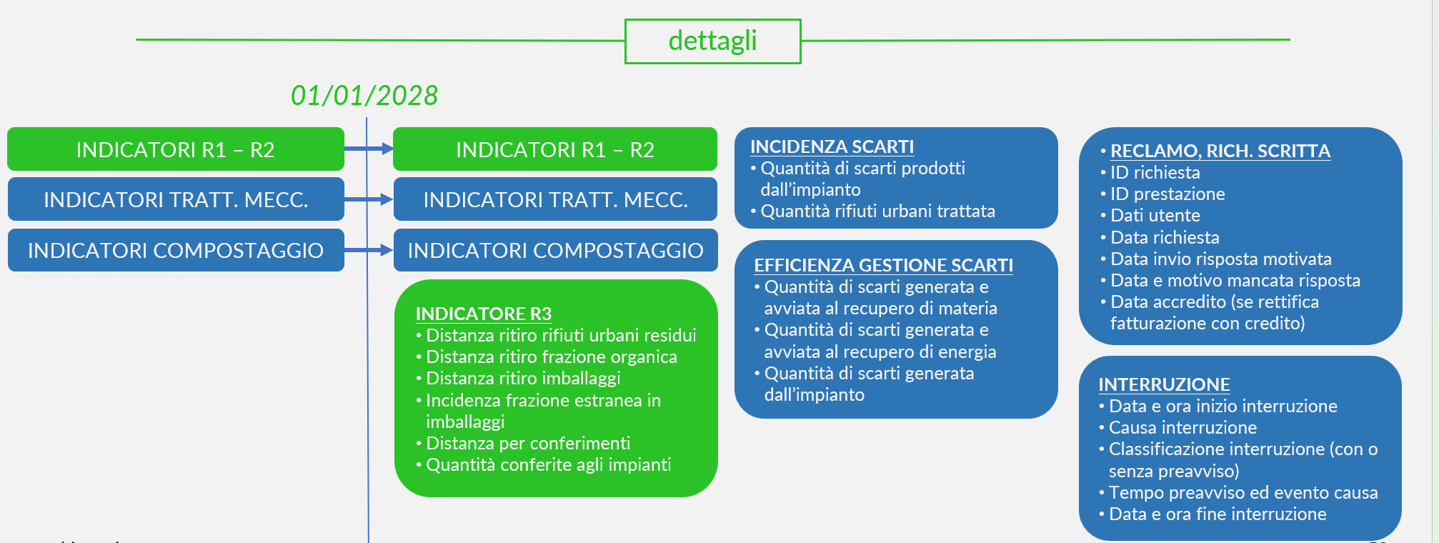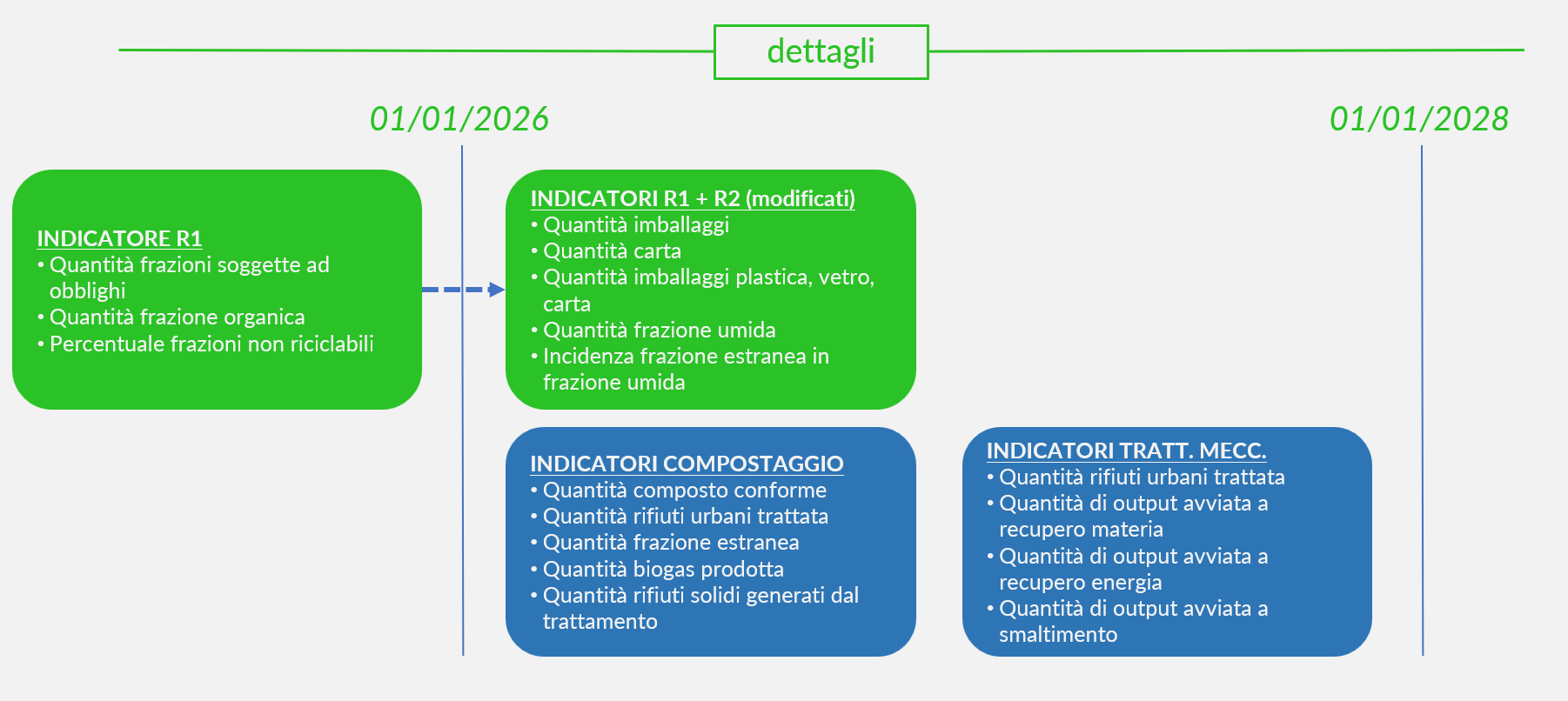 Gli obblighi di monitoraggio e di trasparenza sull’efficienza della raccolta differenziata e sugli impianti di trattamento dei rifiuti urbani si applicano dall’1 gennaio 2024 e si fondano su indicatori ripartiti nelle seguenti categorie: