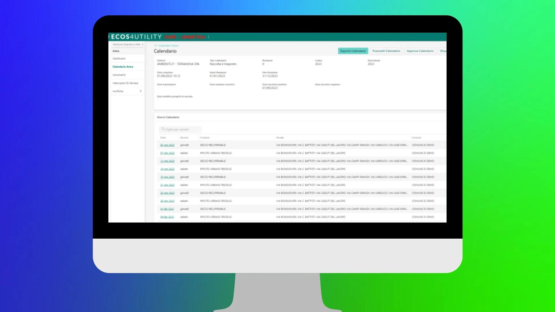 ECOS Gestione Operativa permette nativamente di generare ed esportare i calendari della raccolta e dello spazzamento ricavandoli direttamente dalla progettazione operativa e con un semplice ‘click’.
