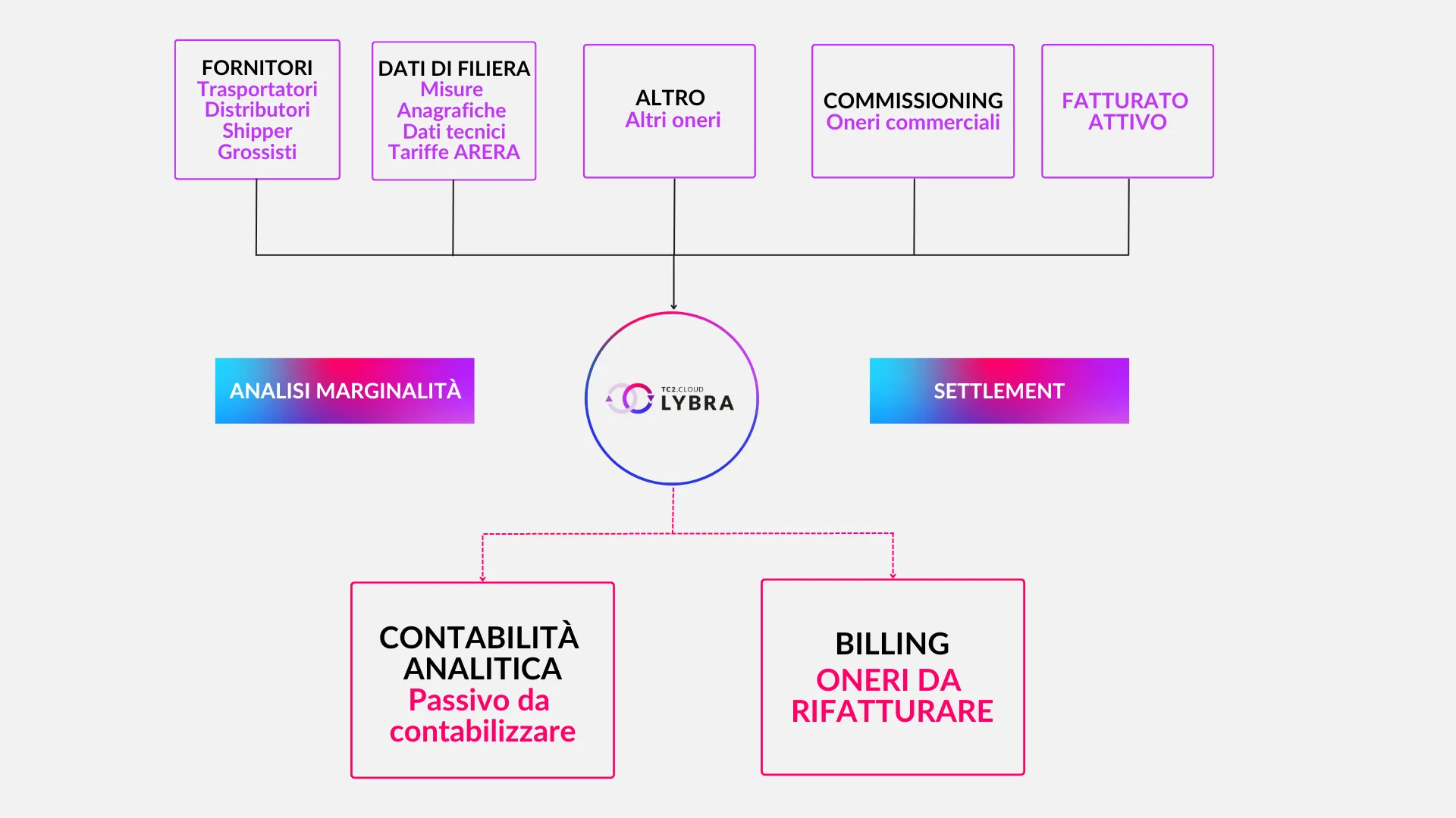 TC2.Cloud Lybra, il Supply Chain Controller esperto del settore! È una soluzione verticale e chiavi in mano, facile da integrare nella mappa applicativa tramite web API o l’interscambio di tracciati che garantisce la totale automazione e la gestione complessiva dei processi di settlement e controllo di gestione. Permette di: