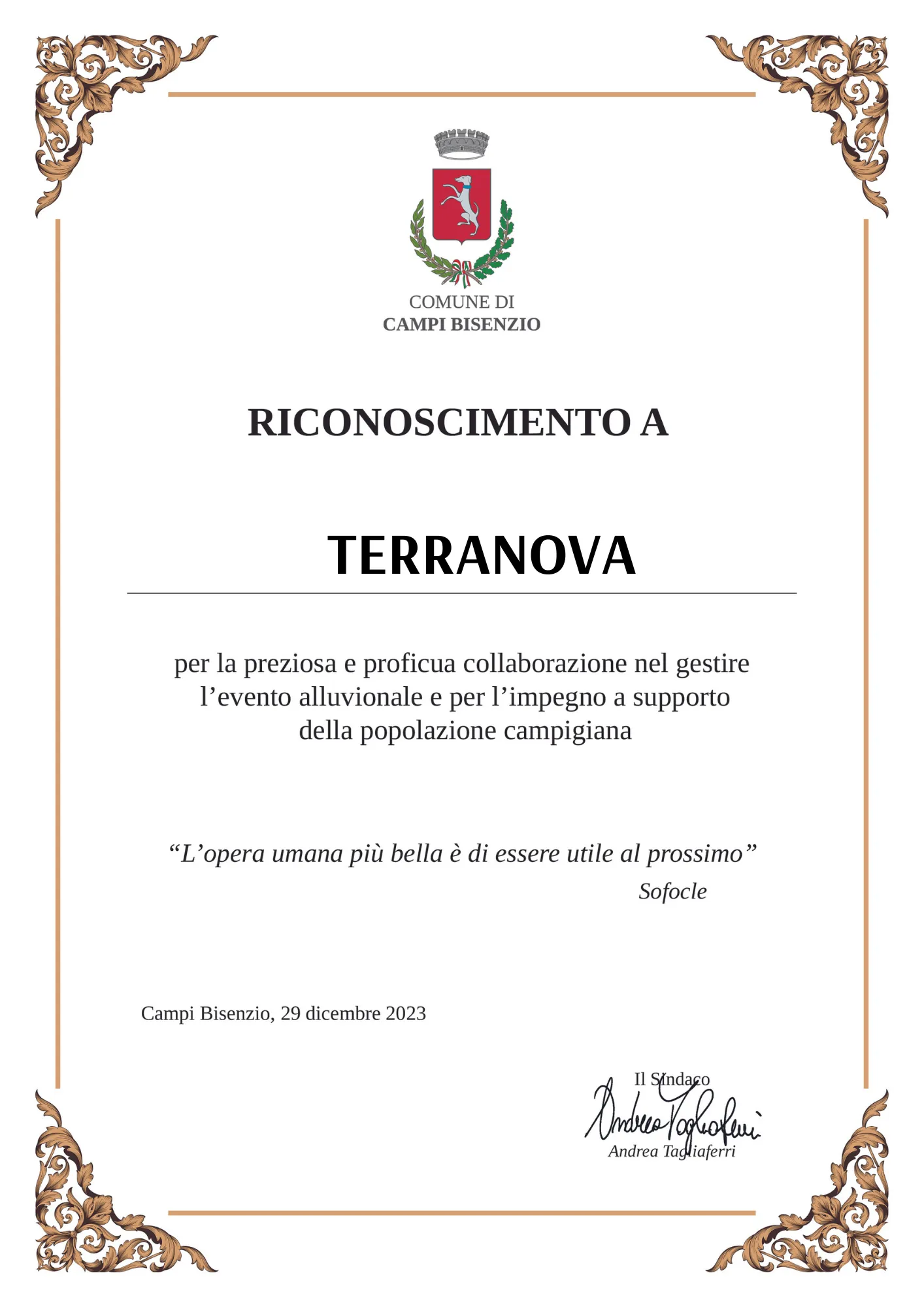 Ringraziamo in particolare l'Assessore Lorenzo Ballerini che ci ha aiutati a capire al meglio come poter indirizzare correttamente il nostro aiuto. Qui riportiamo un estratto della lettera del nostro CEO Alessandro Vistoli al Sindaco: