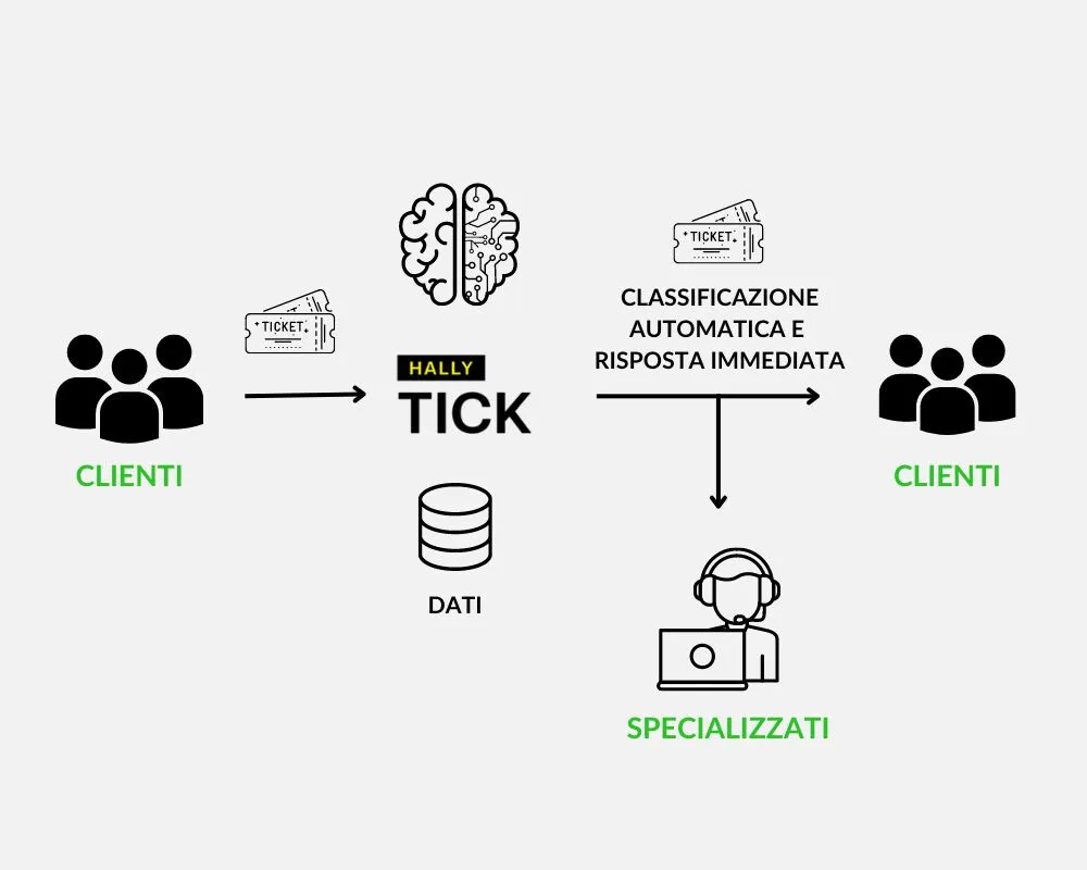 Hally Tick riceve i ticket provenienti dai diversi canali di assistenza (email, sms, social, etc.), li classifica secondo le classi TQRIF e li indirizza al reparto di competenza con l’indicazione del sentiment (positivo, negativo, neutro).