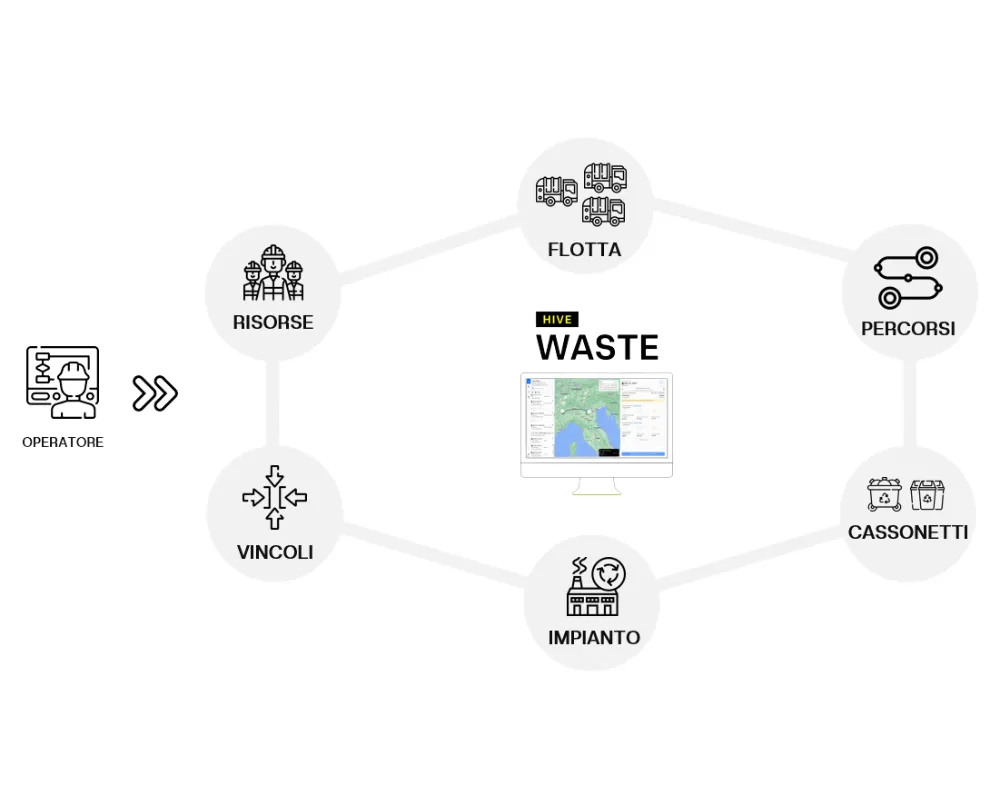 Hive Waste è il software di ottimizzazione sviluppato da HPA che utilizza machine learning sui dati storici dei conferimenti per prevedere la percentuale di riempimento dei cassonetti e innovativi algoritmi evolutivi per gestire tutti i vincoli temporali, operativi e organizzativi al fine di ridurre il carico di lavoro degli operatori, ridurre km percorsi e numero di prese, bilanciare le le attività tra tutti i dipendenti e riprogrammare le attività in caso di imprevisti