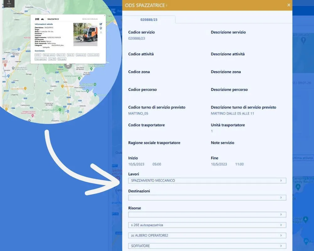 La localizzazione flotte Arcoda applicata alla filiera dell’ambiente offre numerosi vantaggi in termini di miglior coordinamento dei lavori, riduzione dei costi e rendicontazione automatizzata delle attività. L’integrazione con Gestione Operativa permette di associare gli ordini di servizio ai singoli veicoli. Facendo clic sul simbolo del veicolo in mappa si accede istantaneamente a tutti i dettagli dell’ordine di servizio ECOS4UTILITY.