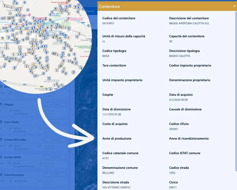 I contenitori gestiti con ECOS4UTILITY potranno essere mostrati su mappa e ciascuno di essi sarà esplorabile in ogni dettaglio con un semplice clic. La rappresentazione cartografica di oggetti numerosi facilita la lettura delle informazioni e offre un quadro generale di più agevole comprensione, velocizzando i processi e favorendo la definizione di strategie gestionali.