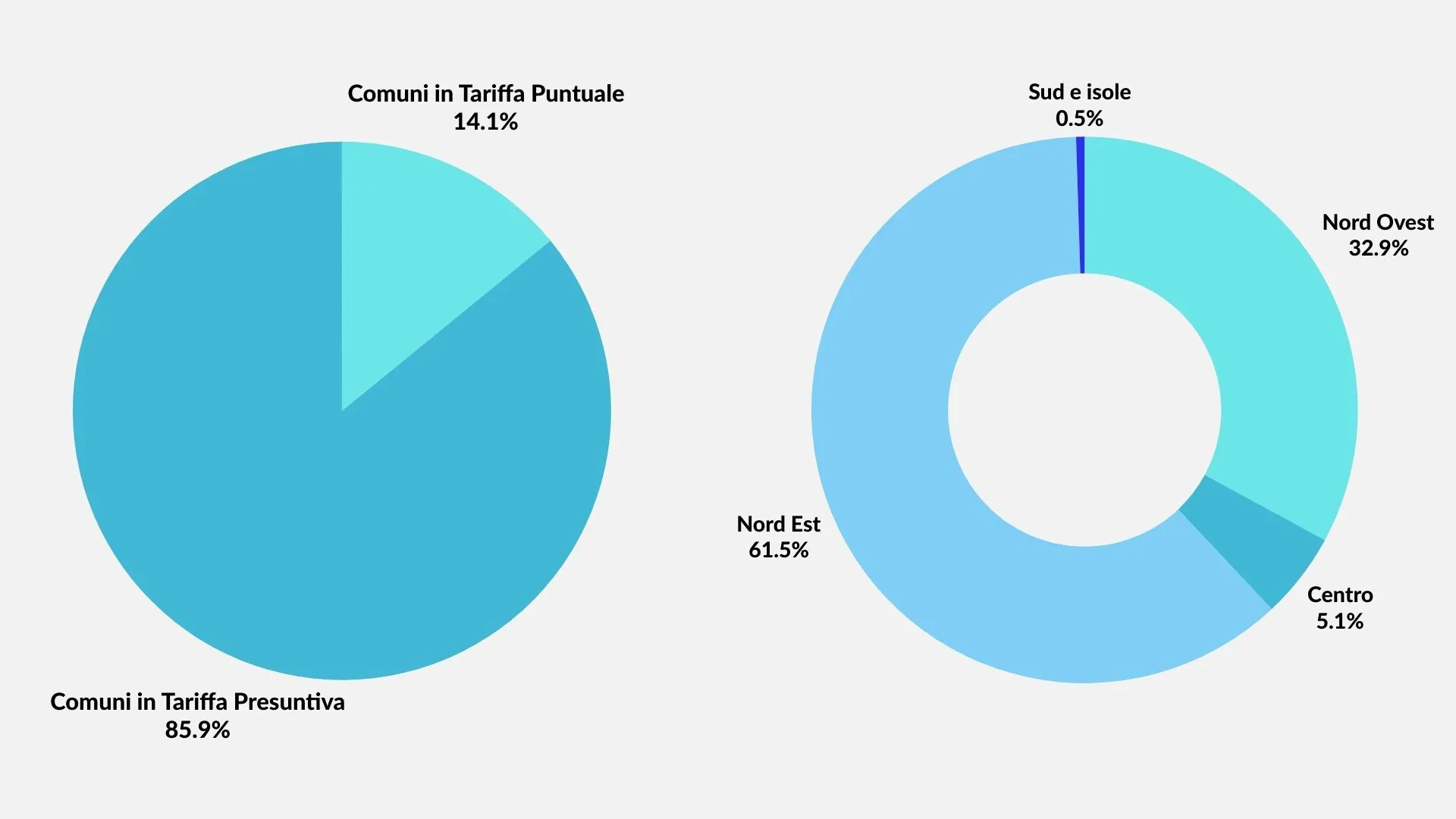 La tariffazione puntuale ha una diffusione ancora parziale nel territorio nazionale con evidenti differenze nelle varie Regioni comprendo una popolazione di 8.086.495 abitanti (13,7% della popolazione italiana) e 1.116 Comuni (14,1 del totale).