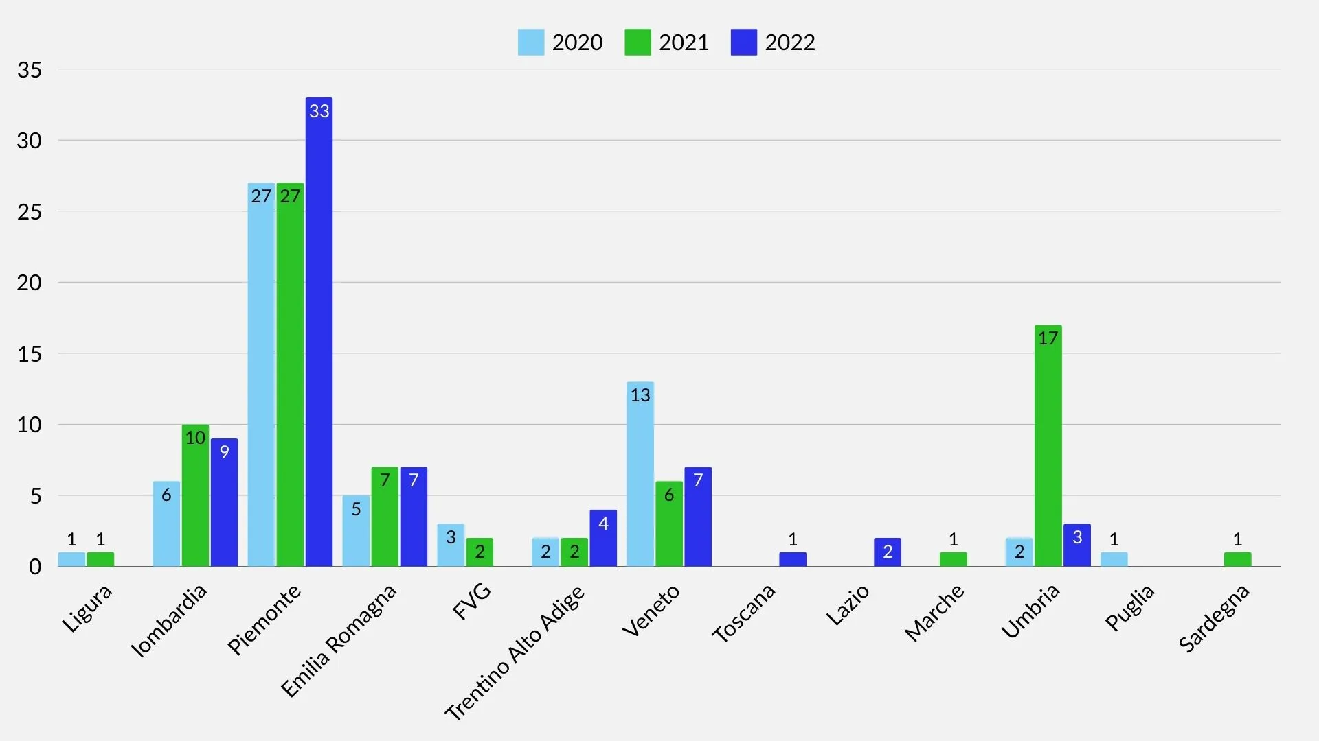 L’anno in cui complessivamente si registra il più elevato numero di passaggi in Tariffazione Puntuale è il 2021, quello con il minore il 2020, segno che, a causa della pandemia, in quell’anno diversi Comuni confermarono le tariffe del 2019 e rinviarono l’introduzione della tariffazione puntuale decisa in precedenza.