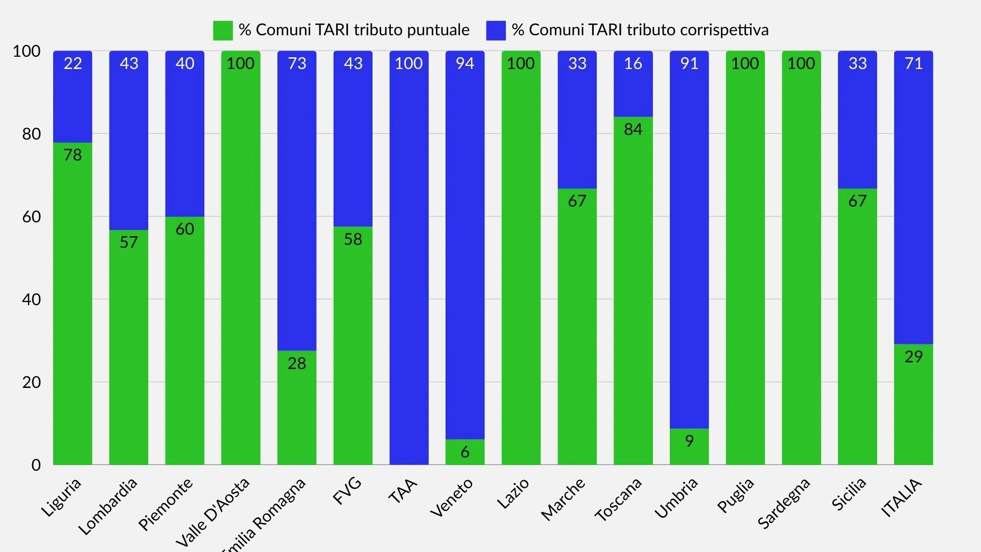 Le esperienze di tariffazione puntuale sono pochissime e la dinamica evolutiva minima; nel 2022 nessun Comune aveva ancora implementato la tariffazione puntuale in 5 Regioni: Abruzzo, Basilicata, Calabria, Campania e Molise. I casi rilevati si trovano in sole 3 Regioni: Puglia, che conta due esperienze (entrambe in Provincia di Bari); Sicilia, con 3 piccoli Comuni in Tariffazione Puntuale; Sardegna: nel 2021 il Comune di Cagliari (circa 148 mila abitanti) ha introdotto la Tari tributo puntuale; grazie alla politica di promozione varata dalla Regione nel 2022.