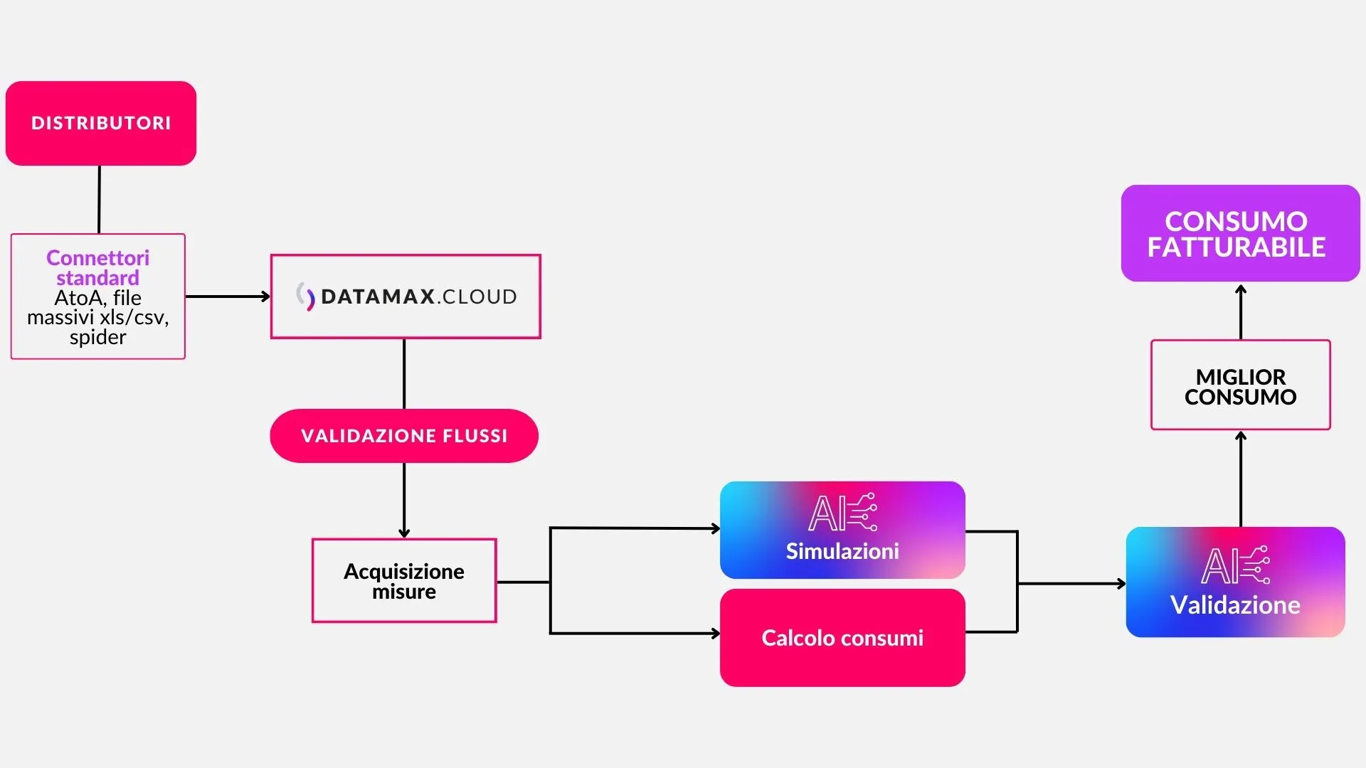 Il processo di misura, grazie all’introduzione dell’AI, subisce una spinta ancora maggiore verso l’automazione. Questo elemento alleggerisce il lavoro in carico agli operatori riducendo l’attività manuale perché tutti i processi che si articolano, dall’acquisizione del dato di misura fino alla generazione e validazione dei consumi e la loro messa a disposizione verso fatturazione, sono del tutto automatici e non necessitano di alcuna azione da parte dell’operatore. L’unica operatività richiesta è quella puntuale e a maggior valore aggiunto finalizzata alla gestione degli errori sui flussi importati a sistema e degli scarti generati a valle del processo di validazione dei consumi.