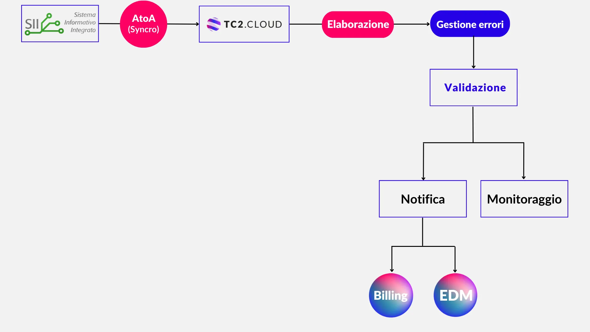TC2.Cloud è un'unica soluzione software che supporta sia le comunicazioni con la PdC e il SII Cloud Processi ma che, allo stesso tempo, garantisce un elevato livello di automazione nell'acquisizione, nell'elaborazione e nella notifica a sistemi di Billing/EDM delle misure acquisite dal SII Cloud Misure. Questo rappresenta un elemento di semplificazione e di efficientamento dei processi a favore del business.