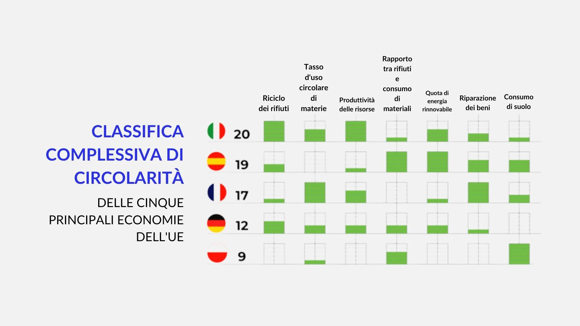 L'italia risulta essere la migliore tra le cinque principali economie della UE (Francia, Germania, Italia, Polonia, Spagna) nella classifica complessiva di circolarità che si basa su sette indicatori: