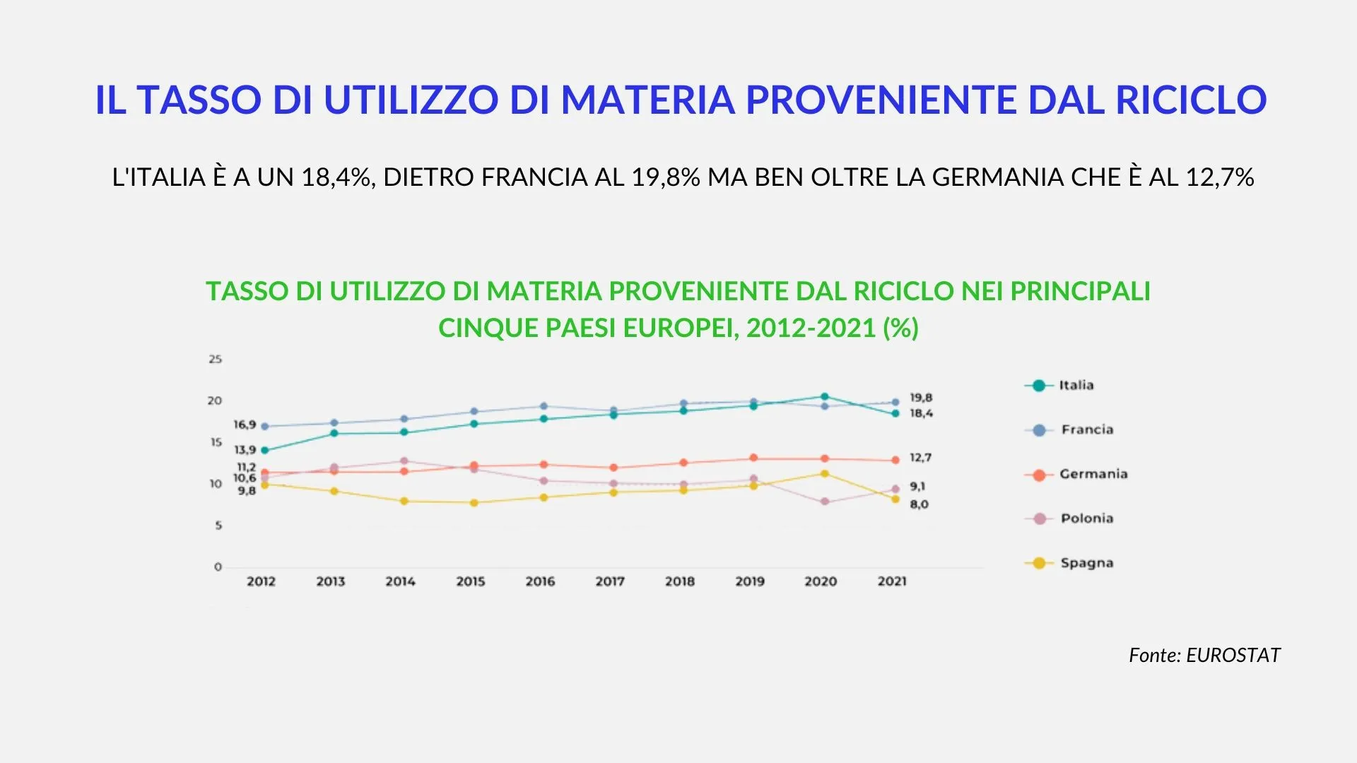 In questo scenario globale l’aspetto positivo da evidenziare sono le performance dell’Italia relativamente al tasso di utilizzo di materia proveniente dal riciclo, l’Italia è al 18,4%, dietro la Francia al 19,8% ma ben oltre la Germania che è al 12,7%.