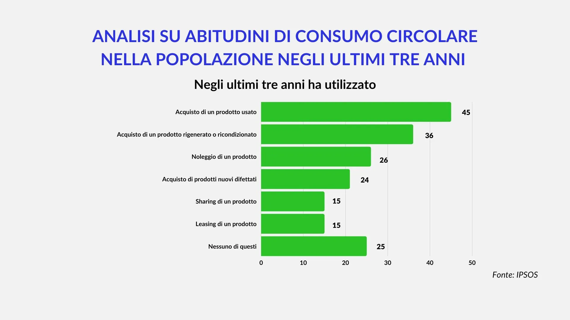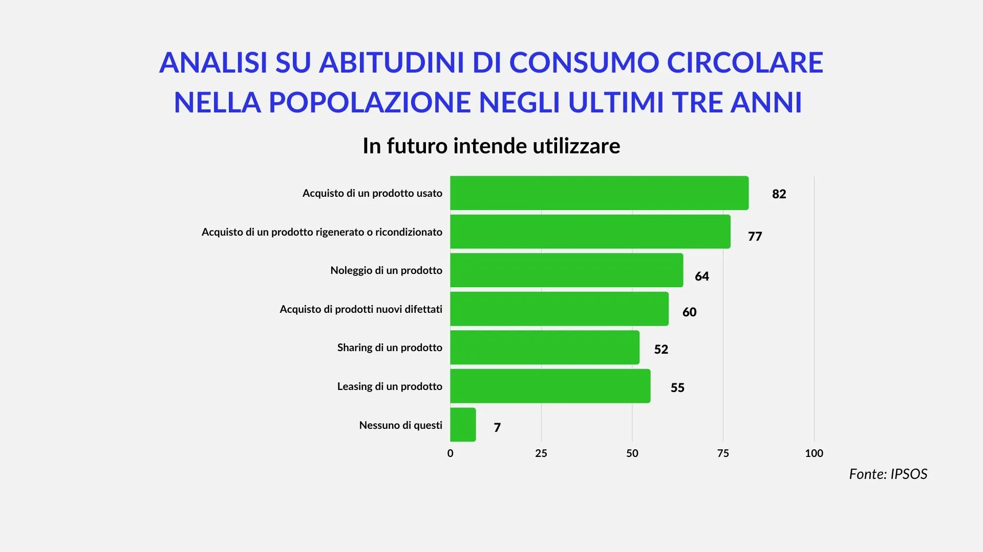 Negli ultimi tre anni, fatta eccezione per l’acquisto di un prodotto usato di più largo consumo (45%), gli altri servizi risultano utilizzati da una minoranza della popolazione. La propensione verso modelli di consumo più circolari è però in consistente aumento, considerando quanti in futuro intendono acquistare un prodotto usato (82%), ma anche noleggiare un prodotto (64%), ricorrere allo sharing (52%) e al leasing (55%).