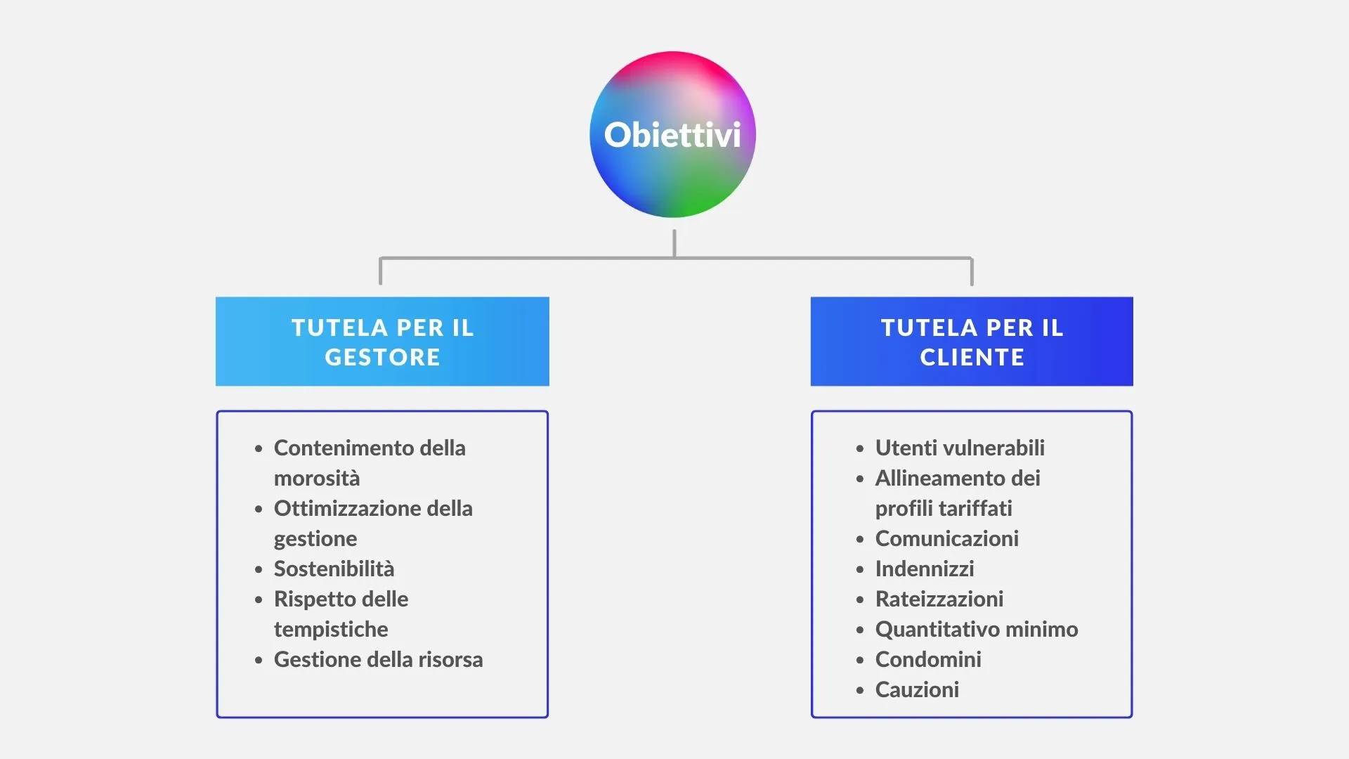 Le procedure e le azioni previste e regolamentate dalla delibera REMSI di cui abbiamo parlato, possono essere pensate anche come una sorta di metodo per raggiungere degli obiettivi a tutela sia per il gestore, come l’efficientamento della gestione della risorsa, sia per il cliente finale, come l’obbligo del gestore di inviare lettere complete di dati precisi, o l’agevolazione sia per le utenze condominiali in cui la fornitura è unica per tutti gli appartamenti, sia la tutela di utenti vulnerabili, come per esempio ospedali o utenti con il bonus idrico.