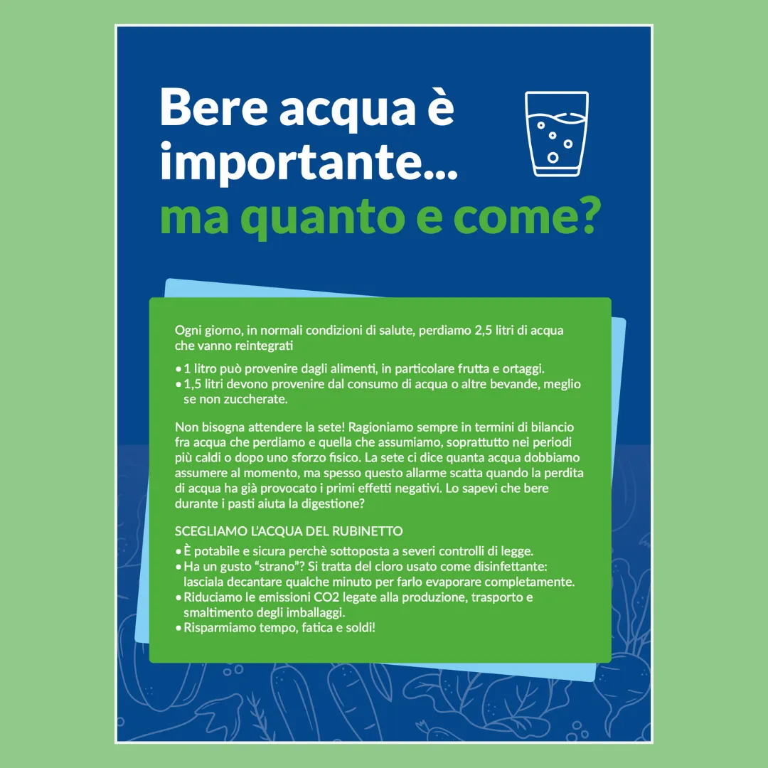 • 1,5 litri devono provenire dal consumo di acqua o altre bevande, meglio se non zuccherate.