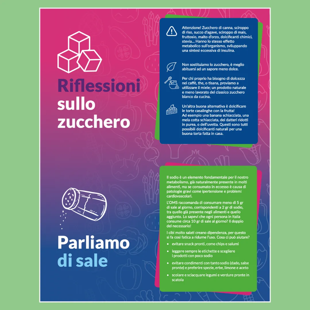 L’OMS raccomanda di consumare meno di 5 gr di sale al giorno, corrispondenti a 2 gr di sodio, tra quello già presente negli alimenti e quello aggiunto. Lo sapevi che ogni persona in Italia consume circa 10 gr di sale al giorno? Il doppio del necessario!I cibi molto salati creano dipendenza, per questo si fa così fatica a ridurne l‘uso.