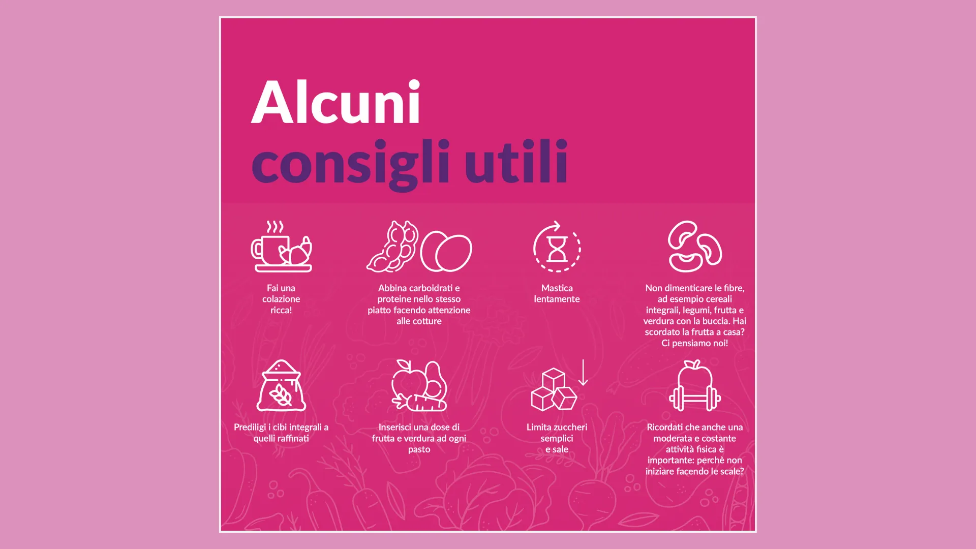 A seguito dell'impegno concreto che portiamo avanti da anni per l'educazione alimentare ed il wellbeing delle nostre persone, abbiamo scelto di racchiudere i messaggi più importanti, estratti dal nostro programma formativo e dalle linee guida della Fondazione Umberto Veronesi, e riportarli sulle pareti delle nostre cucine e in alcuni libri del Terranova Book Club. In questo modo cerchiamo di porre enfasi sui vantaggi psicofisici di una dieta equilibrata ed uno stile di vita sano.