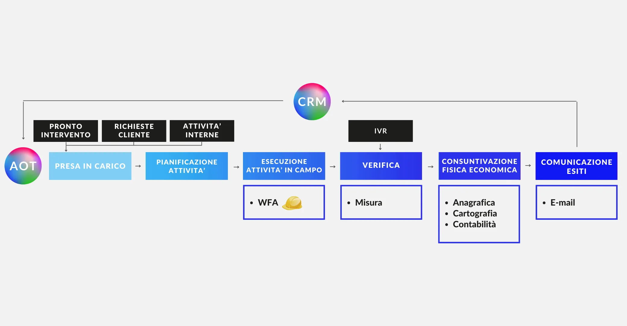 - Integrazione nativa tra i processi: CRM e back office, Ordini di lavoro e Workforce Automation, Ordini di lavoro e fatturazione, reportistica ARERA